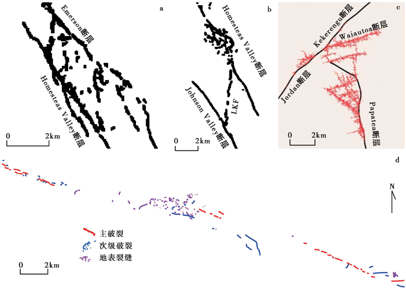 图 11 玛多地震与历史地震复杂几何结构位置的地表破裂图 a 1992年Landers地震Emerson断层与Homestead Valley断层构成的阶区; b Homestead Valley断层与Johnson Valley断层构成的阶区内的分布式地表破裂; c 2016年Kaikōura地震Jordan-Kekerengu-Papatea三联点位置数值模拟的分布式破裂与 损伤(Spotila et al., 1995; Zachariasen et al., 1995; Klinger et al., 2018); d 玛多地震震中区的地震破裂简图