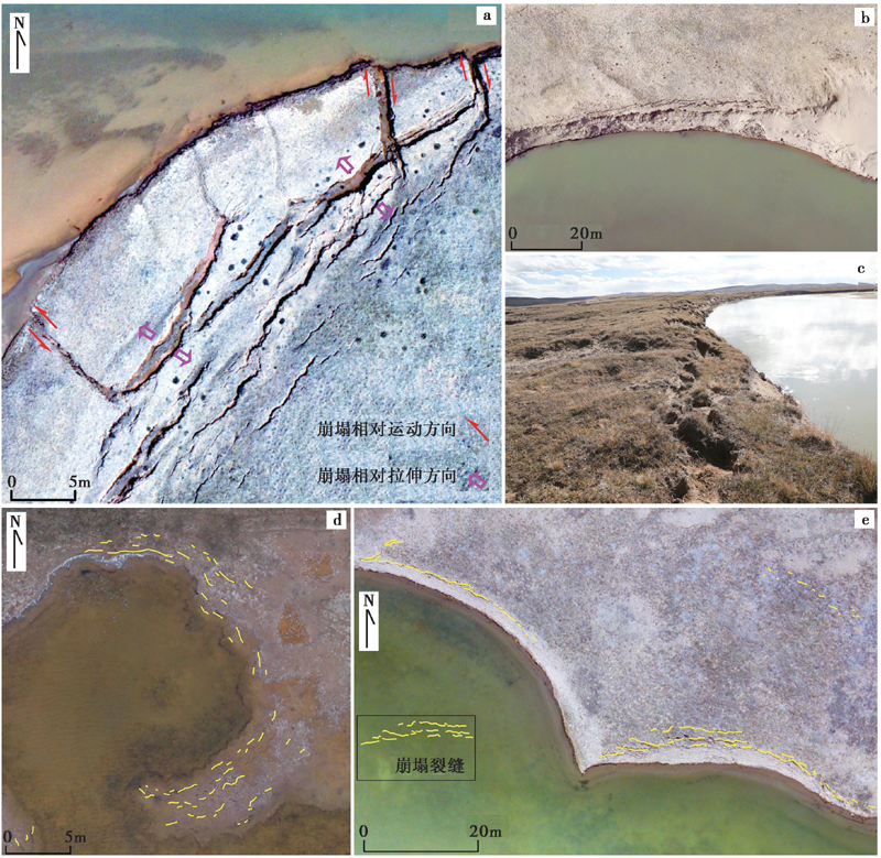 图 8 野外实地拍摄的地表破裂、 地表裂缝照片 a 具有垂向分量的地表破裂; b 沿湖边发育的典型雁列式的地震地表破裂; c 黄河岸边的地表破裂; d 黄河漫滩上的地表裂缝。各照片拍摄于图7所指示的位置