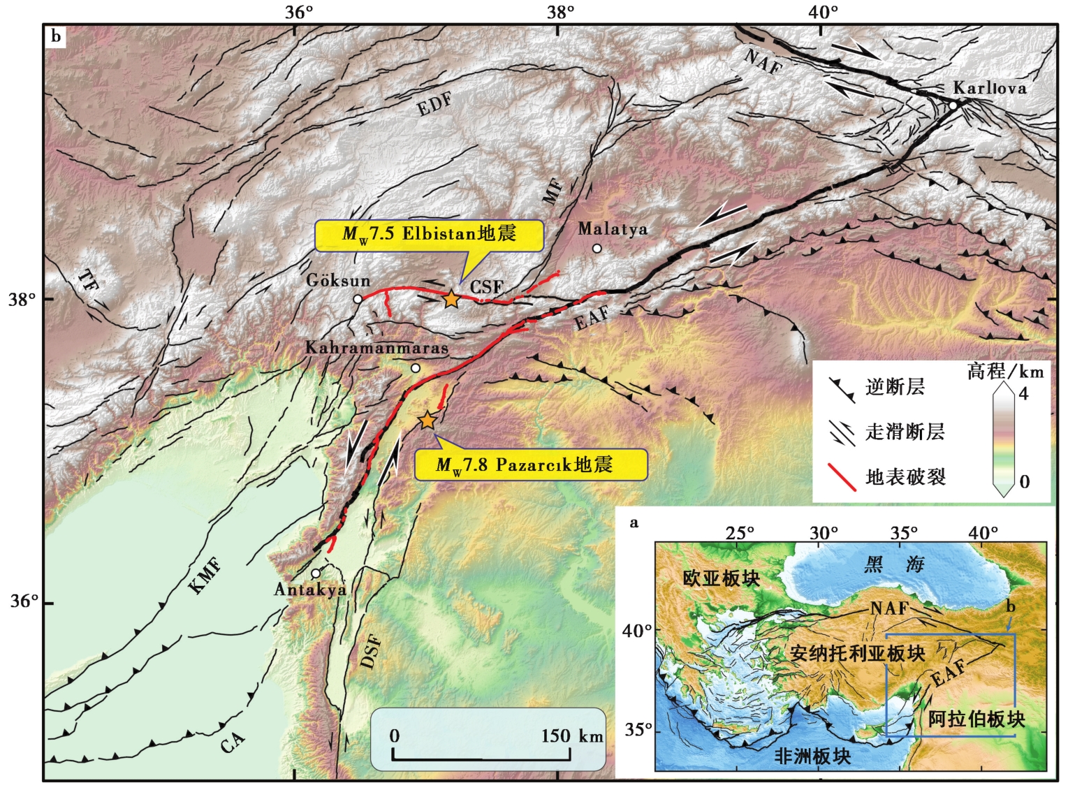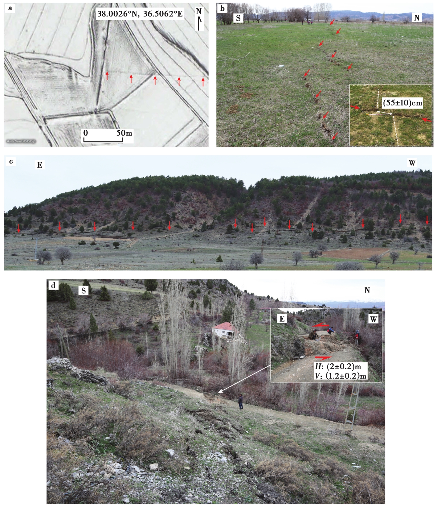 2023年2月6日土耳其东南部发生2次破坏性地震, 中国地震局土耳其地震科学考察队对2次地震的地表破裂开展了详细调查。 震后现场调查表明, 其中第2次地震事件(Elbistan地震)发生在东安纳托利亚断裂带的北分支断裂(Cardak断裂)上, 形成了一条长约140km的主地表破裂带, 同时形成一条与主破裂带近垂直展布、 长约20km的分支破裂。 主破裂带西起Göksun, 沿近EW向展布至Sürgü断裂西端, 然后向NE传递至Malatya断裂带南段, Cardak断裂全段和Malatya断裂带南段为此次地震的发震构造。 地表破裂带总体呈线性连续展布, 各次级破裂呈左旋左阶拉张或左旋右阶挤压的雁列式组合, 沿线一系列冲沟、 山脊、 麦田、 田埂、 栅栏、 道路和车辙等位错标志指示断层以纯左旋走滑运动为主, 野外实测最大水平位错为(7.6±0.3)m。 结合东安纳托利亚断裂带上的历史地震分布和此次“双震”地表破裂与周边活动断裂的几何展布, 认为东安纳托利亚断裂东北段、 Sürgü断裂和Malatya断裂未来的地震危险性应该引起重点关注。