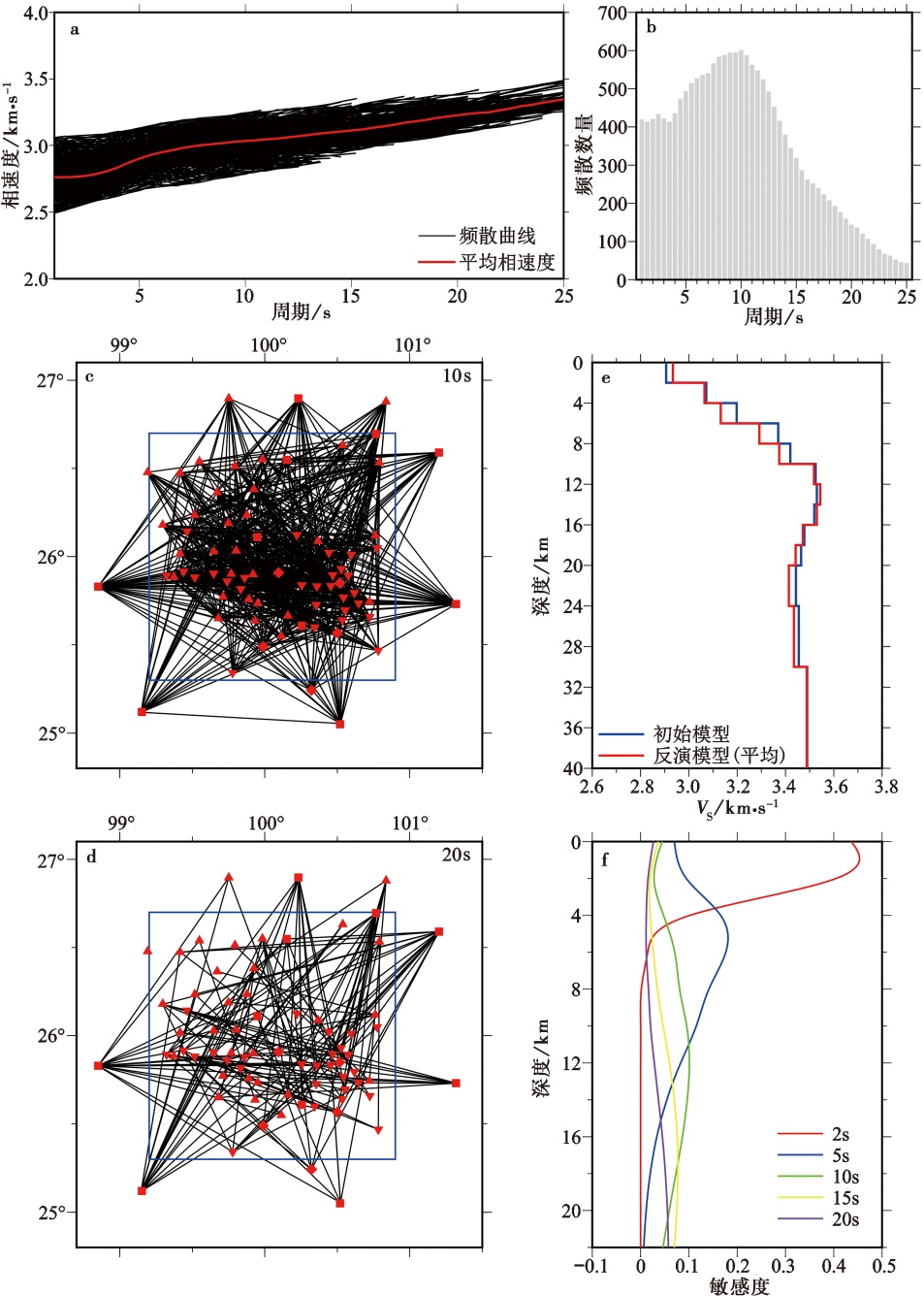 Fig. 2 Rayleigh wave phase velocity dispersion, ray path coverage, comparison of average one-dimensional S-wave velocity models obtained by initial and inversion, and phase velocity depth sensitive kernel in the study area.