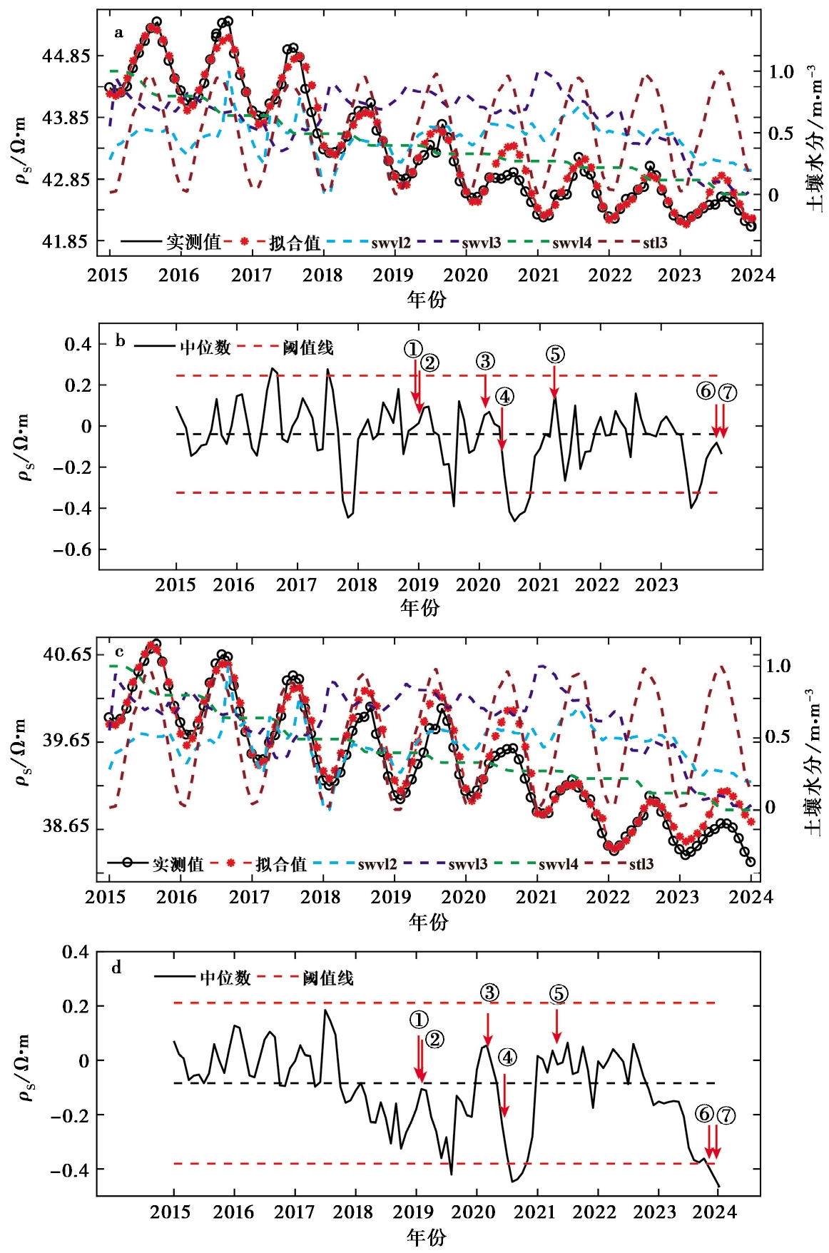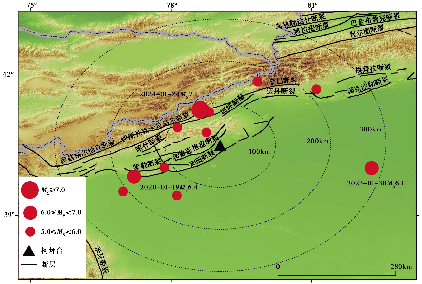 新疆南天山地震带是中国中强地震的主要孕育区之一。 为了增强该区域中强地震监测能力, 2013年在新疆南天山与塔里木盆地交会处建成柯坪地电阻率连续观测台站。 2018年以来, 周边400km共发生11次MS≥5.0地震(不含余震和前震)。 文中利用ERA5同化数据集中的土壤水分含量和土壤温度, 定量拟合了不同水热条件影响下地电阻率背景值, 在此基础上识别了偏离背景值的异常变化。结果显示, 自2018年以来, 柯坪台EW和NS 2个测道共识别到4次显著偏离背景趋势变化的下降变化, 基于断层虚位错模式和地电阻率各向异性变化分析认为, 柯坪台地电阻率变化与7次中强地震的孕震过程存在关联。 以柯坪台EW测道电性结构为参考开展了数值模拟, 结果显示, 当测区介质电阻率下降10%时, 柯坪地电阻率EW测道观测值相较背景值变化1.05%若要被识别, 则电阻率发生变化的上界面需要至少上升至距地表243m深度处, 而这个深度完全可以被柯坪台的现有观测装置所探测。