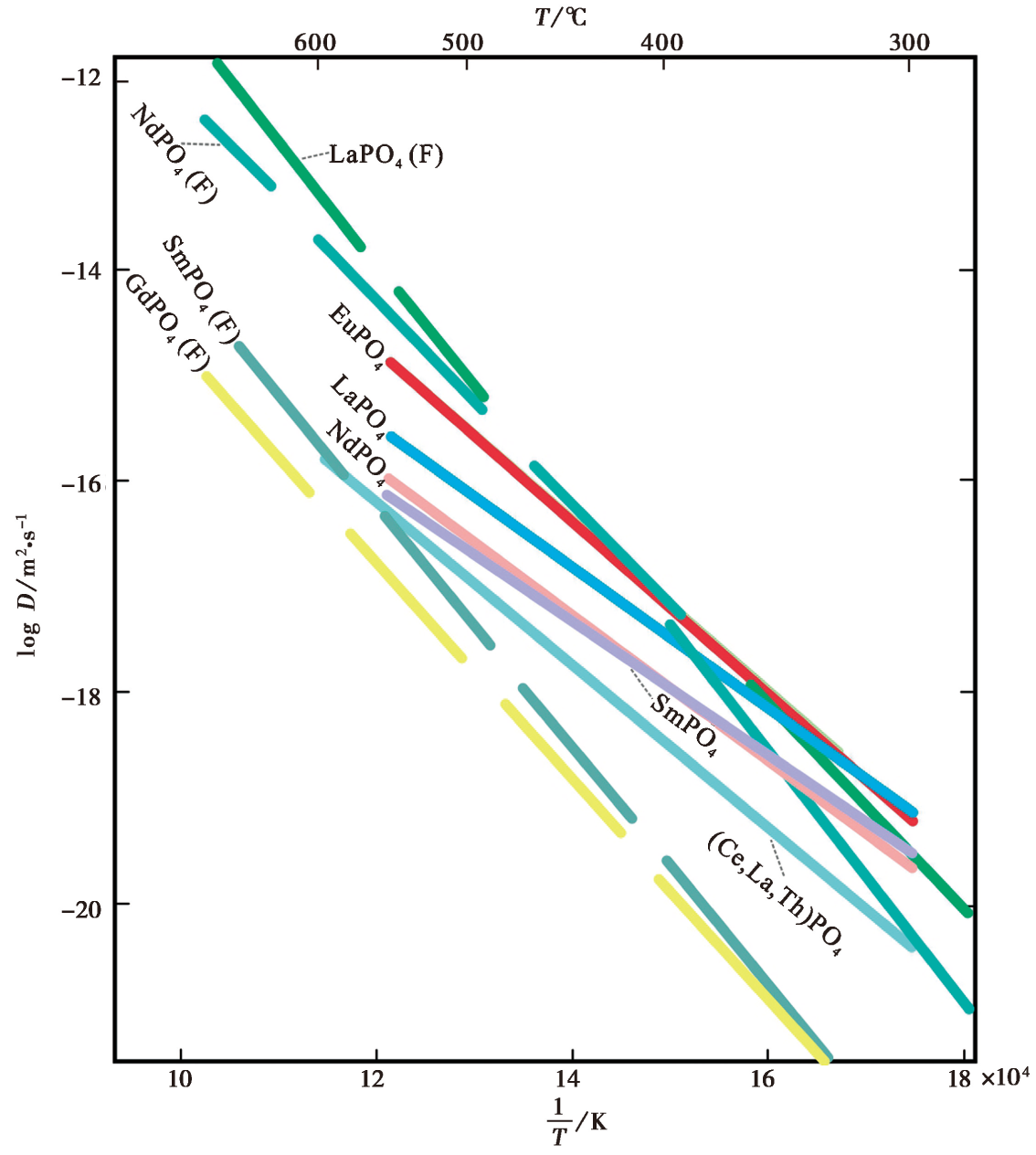 Fig. 1 Summary of measurements for He diffusion in natural monazite and synthetic REE phosphates of monazite structure(modified from Cherniak et al., 2013).
