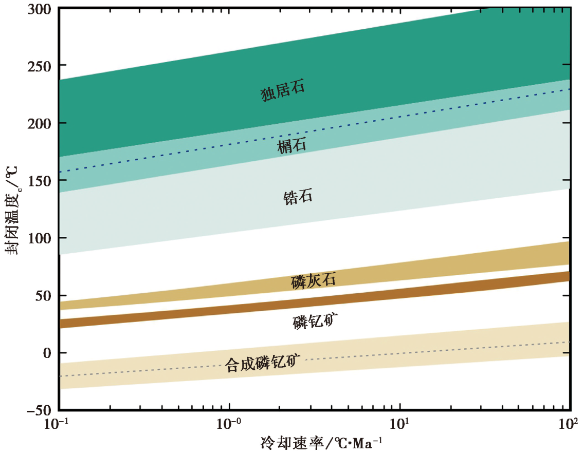 | 独居石 | 1)高铀(2wt%)和钍(15wt%)含量; 2)抗辐射损伤能力强; 3)适用于传统及激光微探针技术; 4)能精确测定微晶体年代。 | 1)4He扩散受晶格成对取代效应、稀土元素含量影响; 2)封闭温度受化学成分和粒径大小影响显著; 3)标准独居石存在复杂化学分区; 4)成分和辐射损伤对年龄准确度影响较大。 | 1)选择成分相似的独居石颗粒进行实验; 2)通过阶段升温方法测试无包裹体独居石碎片的4He扩散系数; 3)合理测量或估算每个样本的4He扩散属性; 4)结合不平衡铀系定年法,提高定年精度。 | |||