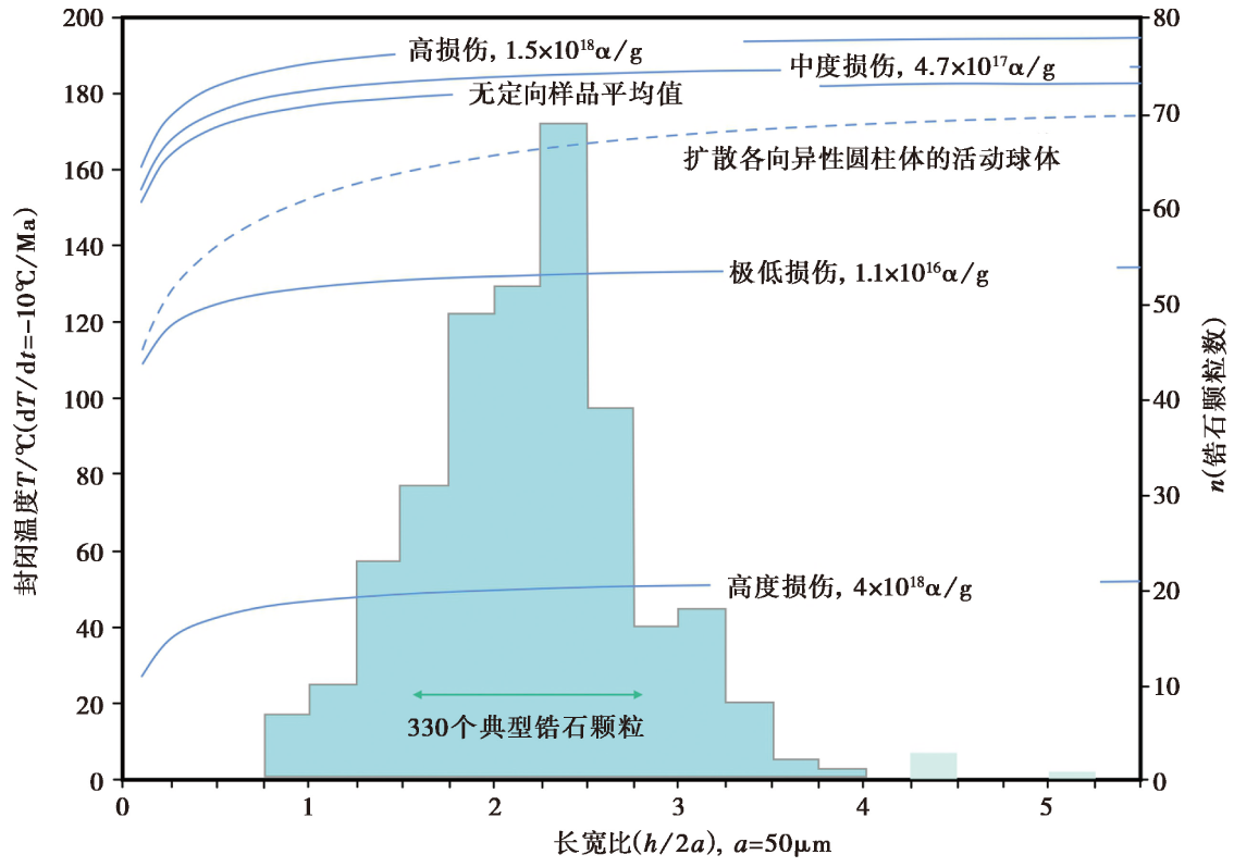 | 硅酸盐矿物 | 锆石 | 1)高度富集铀、钍,受包裹体及周围伴生矿物的影响较小; 2)分布广、易获取,物化性质稳定; 3)具有多重退火效应,该特性为复杂热历史的解读提供了更多可能性; 4)良好的抗风化性能使其成为碎屑矿物物源及耦合研究的有力工具。 | 1)辐射损伤是造成年龄分散的主要因素; 2)晶体结构在受到辐射损伤后变得松散,导致4He在较低温度下逸出,封闭温度随之降低。 | |||