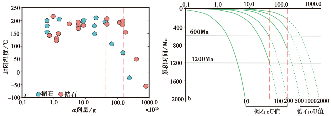 Fig. 4 a Tc(℃)versus estimated alpha dose(α×1016/g) for titanites and zircon, b Accumulation time(Ma) versus alpha dose(α×1016/g) for titanite and zircon of variable eU(modified from Baughman et al., 2017).