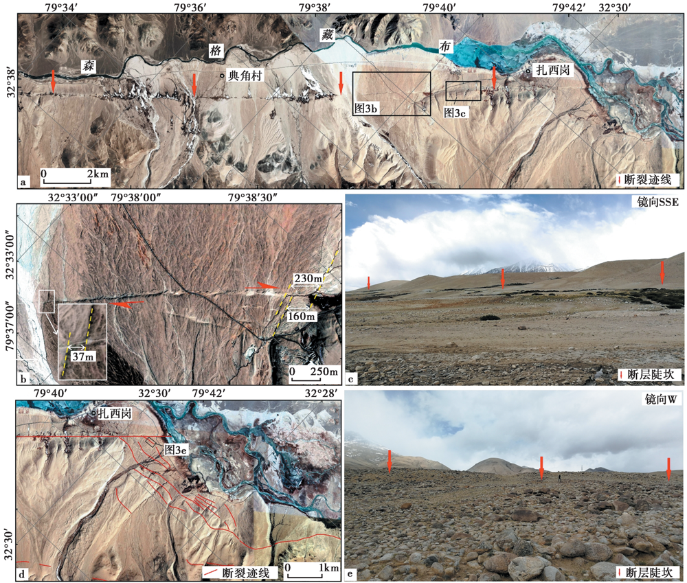 Study shows that the fault can be divided into three sections by Zhaxigang town and Suoduo village, and the structure and properties of each section are significantly different. In west Zhaxigang town section, the fault is dominated by dextral strike-slip with certain vertical movement, it is almost straight on the surface, with river terraces, alluvial-proluvial fans and water system faulted ranging from tens to hundreds of meters. In Zhaxigang town to Suoduo village section, the normal faulting is remarkable, the main fault constitutes the boundary fault between Ayilari Mountain and Gar Basin; fault facets and fault scarps are common along the fault line, there are also secondary faults with the same or opposite dip as the main fault developed near the piedmont basin. In east Suoduo village section, the main part of the fault is located at the south foot of Gangdise Mountain, and in addition to the piedmont fault, several approximately parallel faults are also developed on the southern alluvial-proluvial fans and moraine fans which are mainly dextrally faulted with certain vertical component.