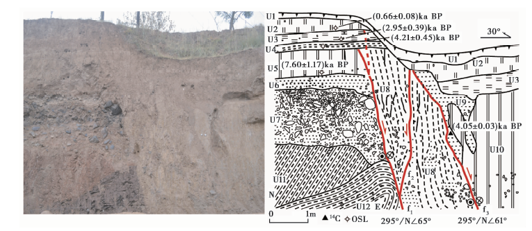 断层f2和f3的最新构造活动均终止在上盘U2-U3之下, 上盘因地势低洼, U1-U3沉积厚度较下盘的大。根据其年代测试结果, 推测该次地震事件可能介于U3和U2之间, 即介于(2.95± 0.39)ka, BP(U3)和(0.66± 0.08)ka, BP(U2)之间。这次地震事件中f1也很可能参与了活动并影响到了U3-U4, 形成多条张性裂缝, 但未断错。