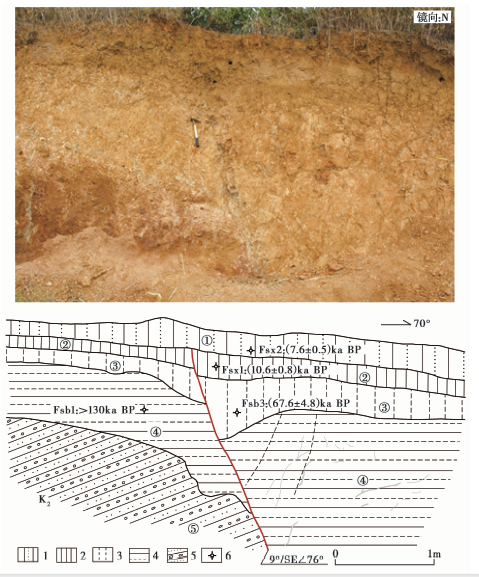 | 图 7 浮山南剖面Pm照片及剖面图1 含砾砂土; 2 粉质黏土; 3 黏土; 4 亚黏土; 5 砂砾岩; 6 OSL取样点Fig. 7 Photo and profile of the fault on the south of Fushan. |
