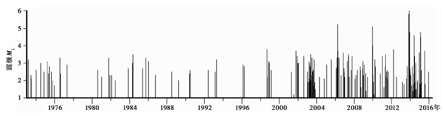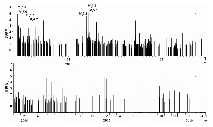 2013年前郭MS5.5震群, 截至2016年4月30日余震仍然没有结束, 地震发生后参与定位的地震台站共计52个, 包括吉林省、 黑龙江省、 内蒙古自治区、 辽宁省台网45个固定台站, 地震现场流动台7个, 所有台站对震中区形成很好的包围, 记录到完整的地震序列(图3), 余震记录下限为ML-0.3。地震序列中5级以上地震发生5次, 由于震级差Δ M≤ 0.5级, 根据《地震现场工作大纲和技术指南》(中国地震局监测预报司, 1998), 前郭地震序列属于震群型, 首发地震MS5.5为主震(吴开统, 1990)。序列中4.0级以上地震呈连发特征(表1, 图3a), 2~3级地震较少, 大多分布在0~1级区间内。