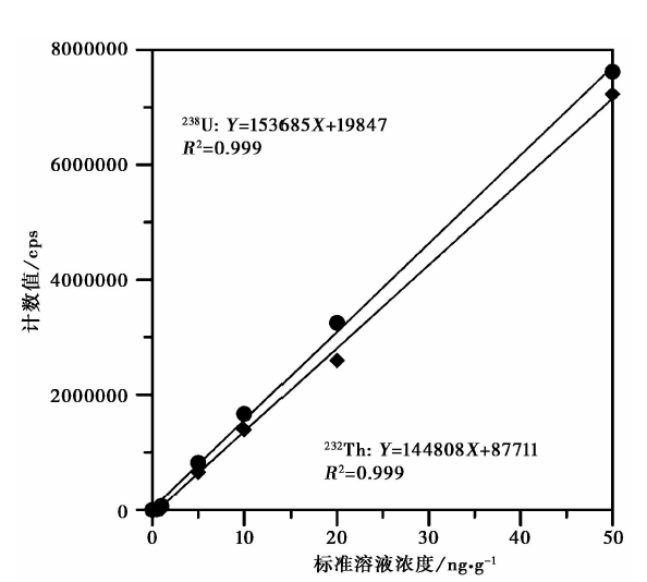 ICP-MS的仪器检测限DL=3× sd/a, 其中sd代表连续11次测量MilliQ超纯水(电阻率> 18.2MΩ )所得到的238U或者232Th计数值的标准偏差; a代表相应同位素的灵敏度。a值通过以下方法获得: 配置7个不同浓度的标准溶液, 浓度分别是0μ g/L、 0.5μ g/L、 1μ g/L、 5μ g/L、 10μ g/L、 20μ g/L、 50μ g/L, 利用ICP-MS获得计数值cps和浓度μ g/L 的关系式, 即标准曲线的关系式y=a× x+b, 其中a值即为灵敏度值, 不同元素的a值不同, 所以不同元素的检测限DL亦不同。