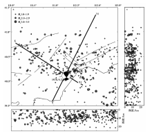 | 图 8 地震重新定位结果 a 重定位后的地震空间分布, 其中F1— F6断裂见图6标注, 沙滩球表示1976年和林格尔6.2级地震的震源机制解及其震中位置; b 重新定位的地震沿纬度和深度方向的分布图像; c 重新定位的地震沿经度和深度方向的分布图像Fig. 8 Relocation results of earthquakes. |