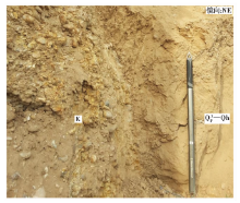 在贾贤庄村东, 地表见出露的断层剖面, 经清理并深挖, 揭示出万全断裂的地层错动和断面结构比较清楚: 断层走向50° , 倾向SE, 倾角72° , 错动了晚更新世— 全新世黄土(图12a); 断面滑动带宽约10cm, 两盘物质相互搅拌、 混合在一起, 沿断面呈褐红色、 黄褐色条带分布, 砾石定向排列(图12b)。从剖面上看, 断层上盘下部为偶含小砾石的黄土, 质地较纯、 较松, 厚度较大, 其顶不整合覆盖1个砂砾石薄层(透镜体), 该层应是在持续稳定环境下堆积的, 靠近顶部采集的光释光样品年龄为(27.0± 1.6)ka; 上部为全新世次生黄土及砂砾石层透镜体。简单地分析, 或许我们可以认为粗粒物质代表不稳定的快速堆积, 黄土则代表缓慢的稳定堆积。基于这一想法, 在不同层位采集了光释光年代样品, 自下而上它们的年龄为(14.1± 1.1)ka、 (6.4± 0.5)ka和(3.6± 0.3)ka。2号样品年龄(14.1± 1.1)ka偏大, 可能是近源堆积的缘故。