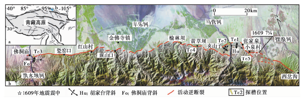 我们沿佛洞庙-红崖子活动断裂, 从东到西, 开挖、 清理了5个探槽, 分别位于东段的小泉村西(Tc5)、 马营河西岸(Tc1和Tc2)、 中段的黄草坝(Tc4)和西段的洪水坝河地区(Tc3)(图1)。