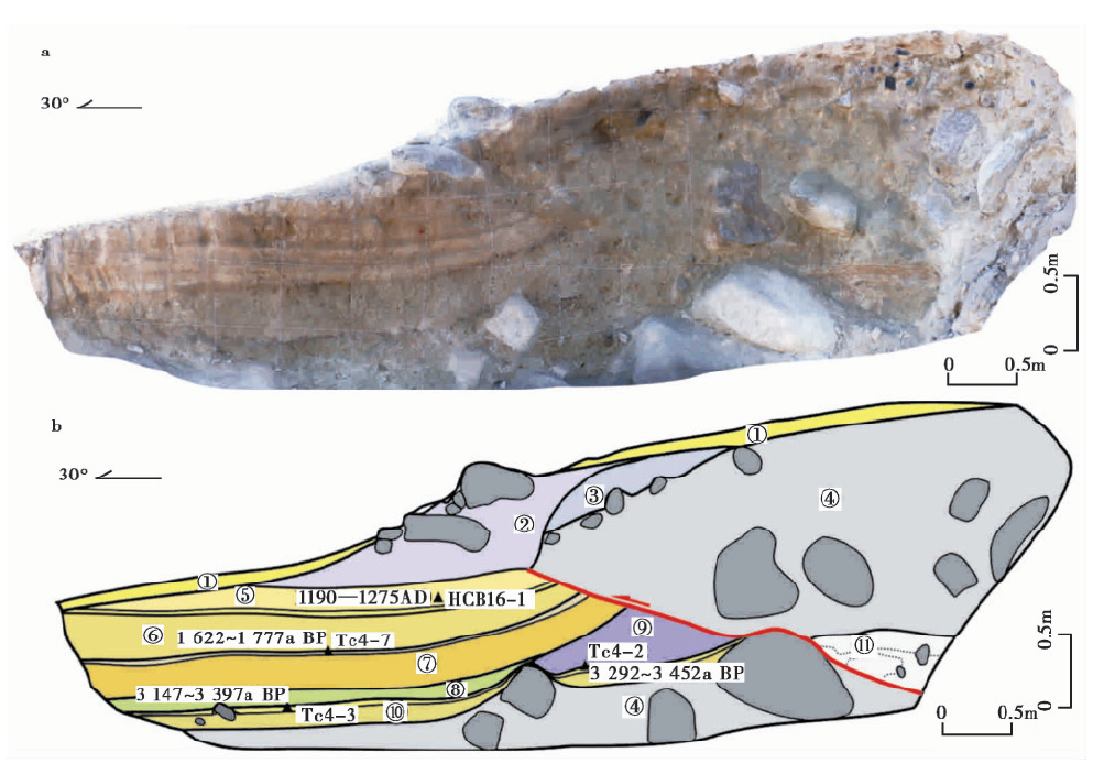 | 图7 马营河Tc2探槽东壁剖面 a 探槽Tc1东壁照片, 镜头向E; b 探槽东壁解译图。地层单元说明见正文Fig. 7 Photo and geology profile of the eastern wall of the trench Tc2. |