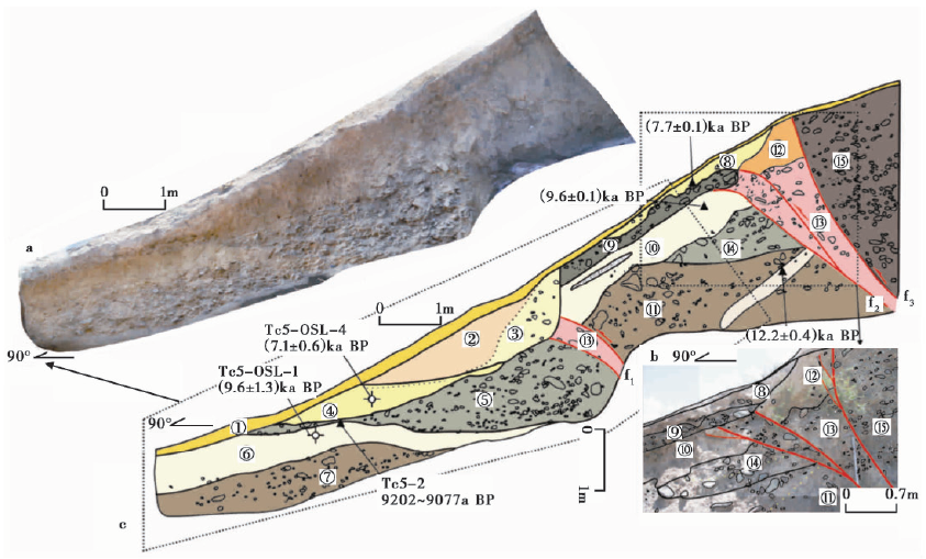 层④位于层③之下, 样品Tc5-OSL-4光释光测年结果为(7.1± 0.6)ka, 与上盘层⑧的年龄接近(14C测年结果(7.7± 0.1)kaiBP, 刘兴旺等, 2014)。层④和层⑧成分、 结构相近, 推测为被断错的同一地层。层⑤砾石堆积被层④覆盖, 西侧与断层f1相接, 西厚东薄, 呈楔形, 以大砾石为主, 且杂乱堆积, 反映1次快速堆积事件。层⑤覆盖在层⑥之上, 后者14C测年结果为距今9i202~9i077a(Tc5-2, 树轮校正), 光释光测年结果为(9.6± 1.3)kaiBP(Tc5-OSL-1)。层⑥年龄和上盘层⑩成分、 结构相近, 年龄相近(层⑩的14C测年结果(9.6± 0.1)kaiBP, 刘兴旺等, 2014), 可能为被断错的同一层位。