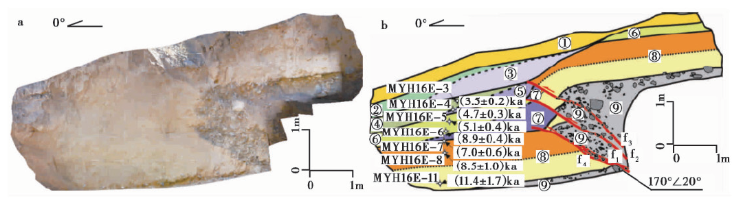 更西侧的断层f3断错了层⑫和层⑮, 上断点接近地表, 仅被松散黄土层①覆盖。该断错事件缺少年龄制约。层⑧向西尖灭覆盖在层⑫上, 发生弯曲变形, 但与断层f3关系不清。