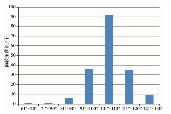 一共提取了沿断层走向分布的180个水系的偏转角(图4)。该角度的分布范围在67° ~130° 之间, 其中绝大多数分布在90° ~120° 的范围内, 低于90° 和高于120° 的只有17个。这说明水系在断层左旋走滑作用的长期影响下, 角度的确发生了偏转。