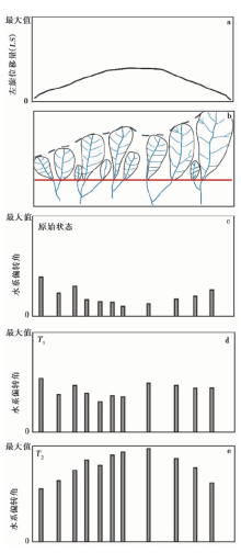 | 图3 偏转角反映断层运动模式原理图 a 左旋位移量分布模式图; b 原始水系分布状态示意图; c 原始偏转角分布图; d T1时间后偏转角分布图; e T2时间后偏转角分布图Fig. 3 Schematic diagram of the relationship between deflection angle and faulting. |