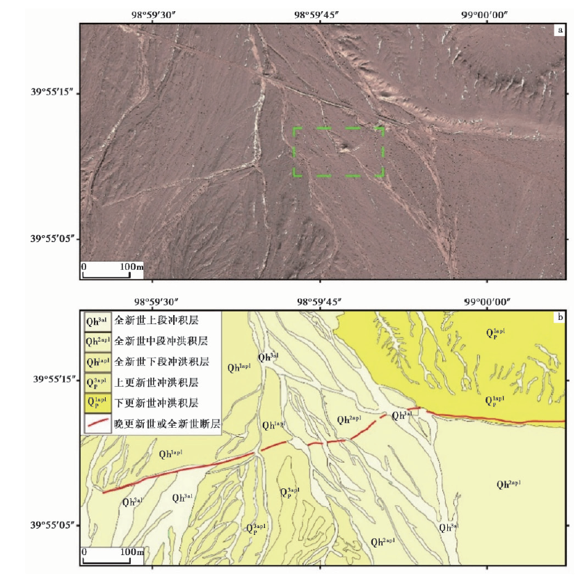 | 图3 探槽开挖点附近断错地貌及沉积地层解译(上图绿色虚线框内指示图4a) a 探槽开挖点附近断错地貌; b 探槽开挖点附近断错地貌地层解译Fig. 3 Faulted landform and strata interpretation near trench excavation site(Green dashed frame in Fig. 3a indicates Fig. 4a). |
