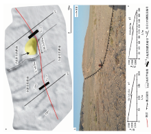 | 图2 金塔南山断裂的几何展布与相关区域的第四纪地层分布(改自张波等, 2016) a 金塔南山断裂总体展布与第四纪沉积地层分布; b, c 鸳鸯池水库东西两侧金塔南山断裂展布图; |