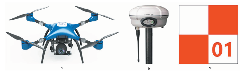 | 图4 无人机数据采集系统 a Motoar Sky MS-670四旋翼无人机系统, 搭载索尼ILCE-QX1相机; b Trimble R8 差分GPS测量系统; c 地面控制点(GCPs)标记, 边长40cmFig. 4 Unmanned aerial vehicle data acquisition system. |
