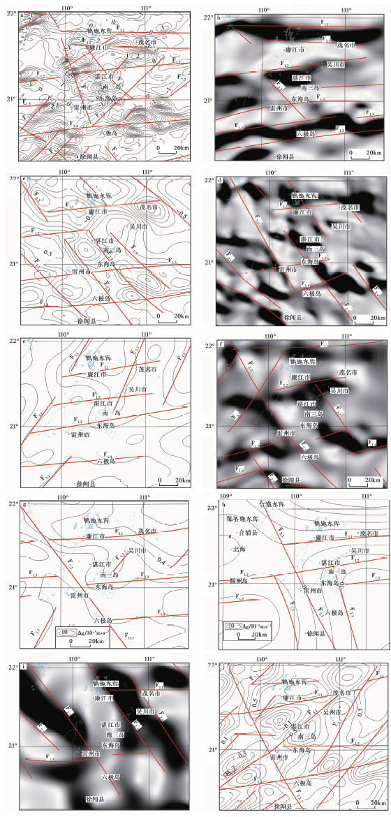 本区域的NW向断裂F2.2灵山-东寨港断裂与F2.3博白-湛江湾断裂分别界限于湛江湾构造区的西东两侧, 区域上归属于红河系F2巴马-灵山-东寨港断裂带, 它们在各类成果图像中的表现也很明显。在原始布格重力异常图(图2)及其上延2km、 5km等值线图中, 灵山、 铁山港、 雷州、 东寨港等地存在NW向等值线带, 虽然各段间多被NEE向等值线带(即F1断裂)分隔, 但总体成带性可辨, F2.2更是重力正负值异常带的明显分界线。在45° 一阶方向导数等值线图中, F2.2与F2.3表现为多条平行、 斜列展布的NW向等值线带, 成带性明显(图3c)。在45° 一阶方向导数灰度图中, 则相应地表现为较宽的、 平行斜列的NW向短黑影带(图3d)。在小波分析四阶细节灰度图中, F2.2与F2.3表现为浓重的NW向黑影条带, 连续性好, 呈区域性延伸(图3i)。此外, 在区域重力异常图中(图3h), F2有十分突出的反映, 尤其是在NEE向F1.2以南, 它占据了1条宽阔的NW向地带, 在该地带抹去了所有NEE向与NE向断裂的痕迹, 使NEE向等值线骤然急剧近直角拐弯呈NW向, 由此可见其在区域上的重要地位。