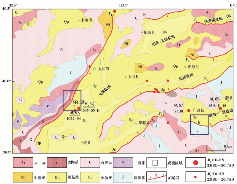 蔚县-广灵断裂和口泉断裂位于燕山褶皱系与山西地堑系交会地带, 是区内历史地震活动较为频繁的地带(邓起东等, 1973; 刘光勋等, 1982; 徐锡伟, 1989; 徐锡伟等, 1990; 王乃梁等, 1996; 张文朋, 2011)。大量的观测及研究成果表明, 蔚县-广灵断裂和口泉断裂为该区未来可能孕育和发生中强地震的断裂, 受到了构造地质及地震地质学者的关注(徐伟等, 2011a; 李煜航等, 2013; 王霞等, 2015; 王林等, 2017)。蔚县-广灵断裂为山西地堑系北部蔚广盆地南缘断裂, 西起广灵县上白羊村, 东至蔚县的上河村, 全长120km, 总体走向NWW-NEE-NE, 倾向NNE-NW(图1), 其活动分段特征明显、 新构造活动较强, 为1条具有正断性质的活动断裂(周廷儒等, 1991; 李树德, 1997; 徐锡伟等, 2002; 王林等, 2011; Wang et al., 2013)。该断裂带距今9i000a以来共发生3次古地震事件, 复发周期为1i700a, 自有历史记载以来, 断裂附近分别于公元前231年和1618年发生过2次6$\frac{1}{2}$级地震(王林等, 2017)。根据地貌差异, 蔚县-广灵断裂自东向西可分为上虎盆段、 松枝口段、 北口段、 唐山口段和上白羊段5个地震破裂段落, 其中唐山口段属于全新世活动断裂, 平均滑动速率约1.6mm/a(徐锡伟等, 2002)。口泉断裂位于山西地堑系北部大同盆地内, 是大同断陷盆地西边界断裂带, 断裂北起大同市官屯堡附近, 南至山阴县洪涛山前, 全长160km, 走向总体NNE, 倾向SE(图1), 为1条具有正断性质的活动断裂。已有研究表明, 该断裂曾发生过4次地表破裂的古地震事件, 平均间隔约3i740a, 自有历史记载以来, 该断裂附近分别于1022年和1305年发生过2次6$\frac{1}{2}$级地震。据断裂的活动强度和构造特征, 可将口泉断裂分为北、 中、 南3段, 其中石井村-鹅毛口段的构造活动性最强, 其滑动速率为0.4mm/a(邓起东等, 1995; 谢新生等, 2003; 徐伟等, 2011b; 张文朋, 2011)。