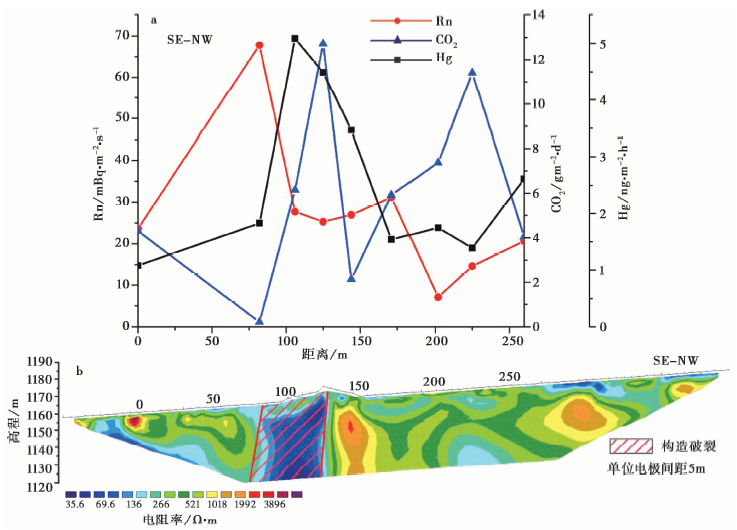 图5a为口泉断裂土壤气Rn、 Hg和CO2通量分布曲线。由图可知, Rn、 Hg和CO2通量曲线均出现1组峰值异常形态, 其最大值分别为 67.79mBq· m-2· s-1、 5.09ng· m-2· h-1 和 12.72g· m-2· d-1, 而且Rn、 Hg和CO2的异常高值都出现在75~130m处, 与高密度电法推测的口泉断裂构造破碎带宽度基本一致。由图5b高密度电法剖面可见断裂的上盘构造裂隙发育, 下盘则无明显构造裂隙发育, 构造破碎带接近地表。通量异常峰值也出现在断层的上盘, 它指示了断层的倾向。