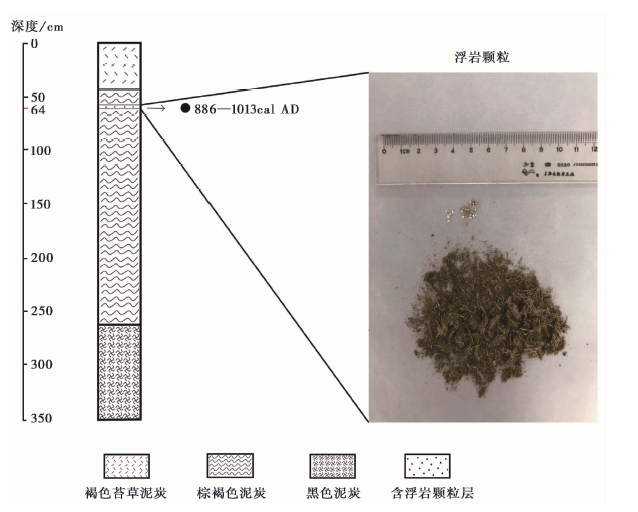 对泉阳泥炭沉积物进行间隔为1cm的连续取样, 由于泥炭沉积物根系等有机质含量较高, 未出现明显的肉眼可见的连续火山灰层, 在钻孔深64cm处发现数粒(20~25颗/cm3)大小不等的浮岩颗粒(图1), 这些浮岩颗粒夹杂在泥炭沉积物之中, 而在深63cm和65cm处未发现大颗粒浮岩, 说明了64cm为火山灰层。将这些浮岩颗粒首先加入30%的H2O2静置24h, 用于除去粘附在浮岩之上的有机质, 然后再加入10%的稀盐酸(HCl)静置12h, 用于去除可溶性碳酸盐等无机盐。