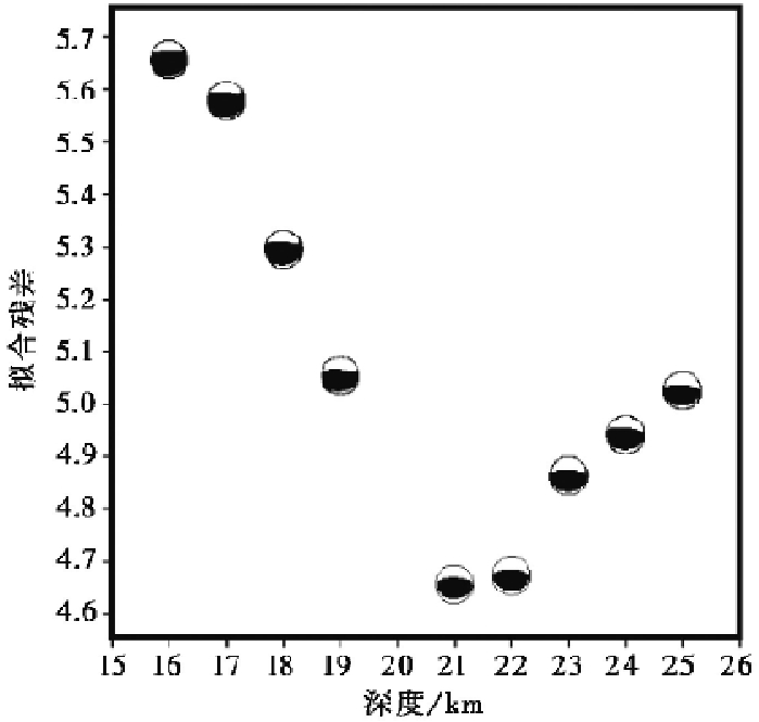 | 图3 2016年12月8日MS6.2新疆呼图壁主震不同深度上地震全矩张量解及其反演方差Fig. 3 Full moment tensor solutions and inversion variances in different depths of the December 8th, 2016 Hutubi, Xinjiang, MS6.2 mainshock. |