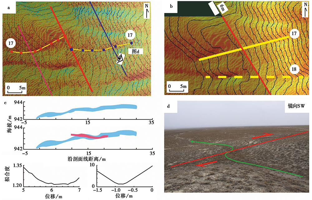 沿断层线发现的冲沟最小右旋位错为(6± 1)m, 图 3中的17号冲沟(83.0578° N; 44.4716° E)发育于Fan3a上, 野外实地测量其右旋位移量为(6.5± 0.5)m(图5d), 通过laDiCao_v2_1软件测量得到该冲沟的右旋位移量是(6± 1)m(图5a— c)。 使用laDiCao_v2_1软件将17号冲沟恢复完成后, 18号冲沟的上、 下游也基本对齐, 右旋位错量也约为6m(图5b)。