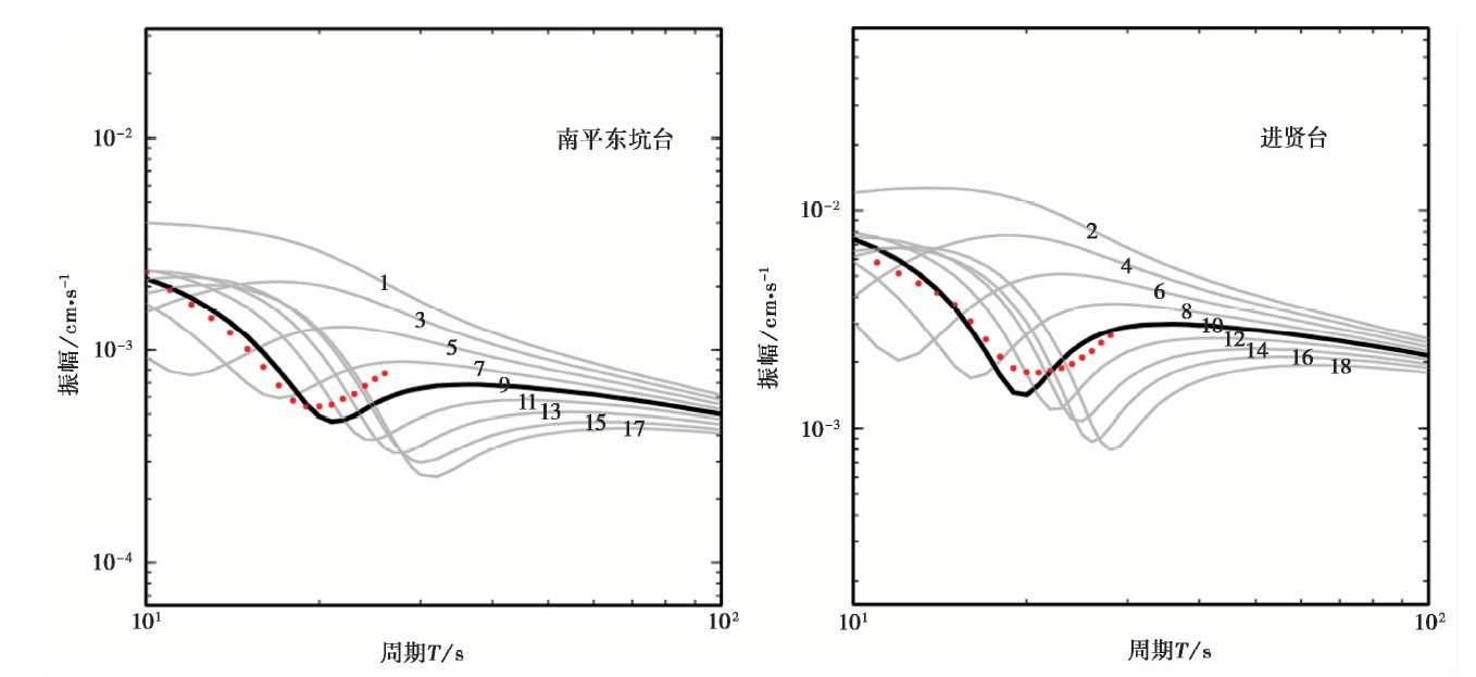 提取所有垂直向波形数据的Rayleigh波频散曲线, 挑选出其中具有明显频谱极小值点的台站。依据本次地震事件的波形数据共筛选出2个台站, 分别是南平东坑台(NPDK)和进贤台(JIX)。基于所得的震源机制解, 计算南平东坑台(NPDK)和进贤台(JIX)震源深度1~21km的Rayleigh波理论振幅谱, 将实际观测波形的Rayleigh波振幅谱和理论Rayleigh波振幅谱进行比对。 结果显示, 南平东坑台(NPDK)在震源深度9km, 进贤台(JIX)在震源深度10km的情况下实际观测波形的Rayleigh波振幅谱与理论Rayleigh波振幅谱吻合程度较高, 故利用Rayleigh波振幅谱测定的广西苍梧MS5.4地震震源深度为9~10km(图9)。