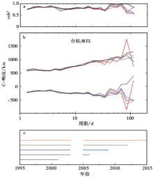 | 图 6 数据中断影响分析 a 平方一致性曲线; b 不同中断记录的C-响应结果; c 中断程度示意图Fig. 6 Impact of data interruption on the estimation of C-response at MZL observatory. |
