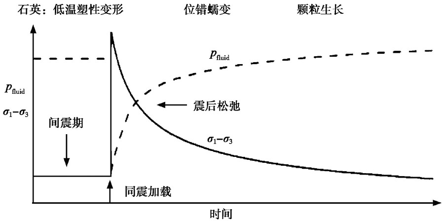 | 图 1 地震周期各阶段石英的变形机制、 应力和流体压力随时间变化模型(Trepmann et al., 2003)Fig. 1 The model of deformation mechanism, stress and fluid pressure change with time in an earthquake cycle(after Trepmann et al., 2003). |