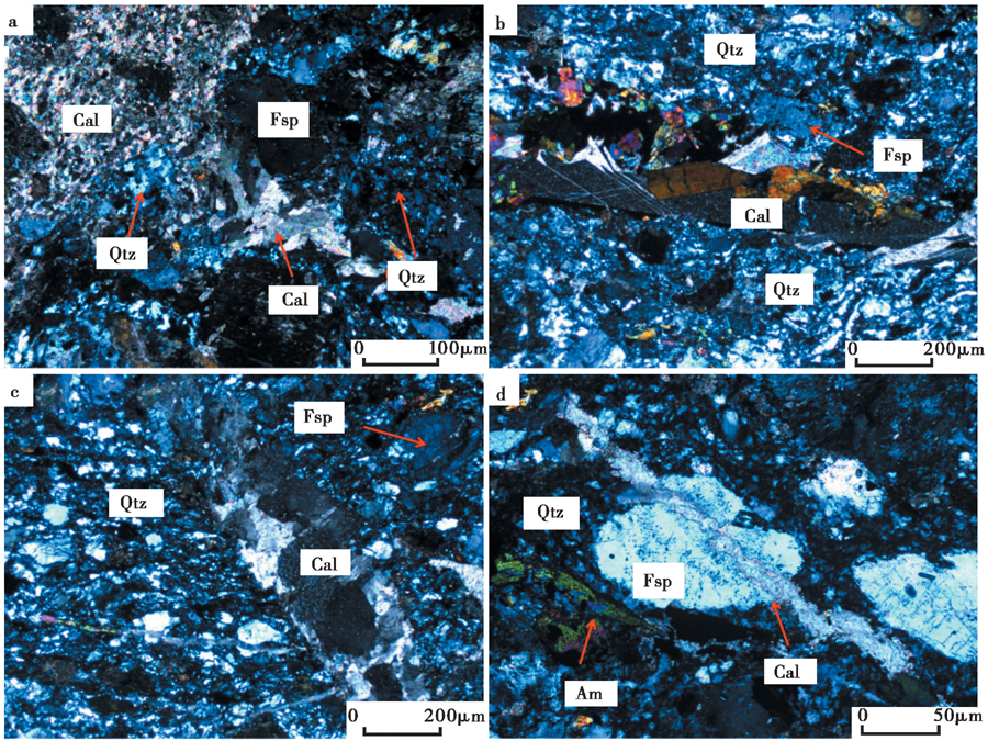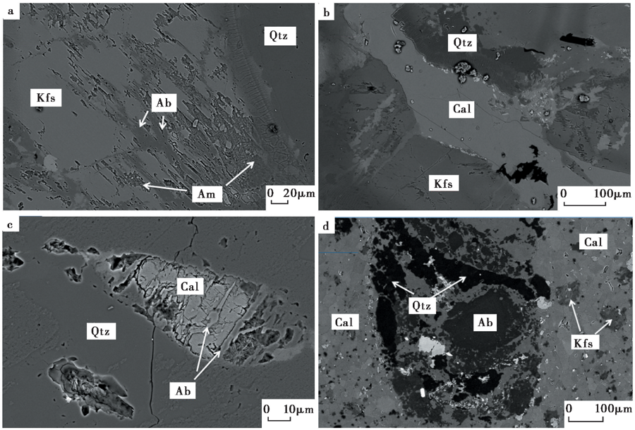 | 图 5 样品Y11-2A在扫描电镜下的矿物组合及微观结构特征 Qtz 石英; Fsp 长石; Ab 钠长石; Kfs 钾长石; Am 角闪石; Cal 方解石。 a 长石中具明显的压碎裂纹; b 大颗粒方解石充填裂隙; c 长石假形被方解石充填; d 斜长石出溶钾长石Fig. 5 The microstructure of sample Y11-2A under SEM. |