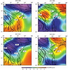 | 图 6 青藏高原东南缘年度累积时变重力场(2005— 2009年)Fig. 6 Annual cumulative time-varying gravity field in southeastern Tibetan plateau(2005— 2009). |
