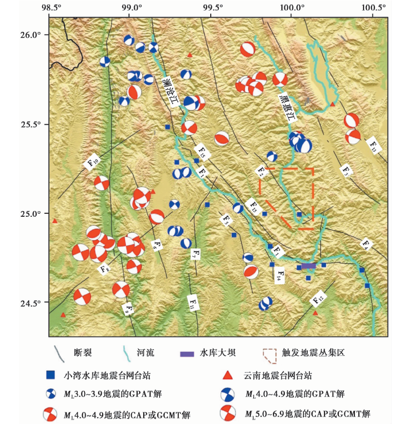 小湾水库建立在多震的云南西部, 蓄水前在库区及其附近记录到了大量的地震, 蓄水后又触发了库区的小震丛集活动(姜金钟等, 2016), 为分析、 探讨水库蓄水前后的应力状态提供了较好的基础。 本文旨在利用这些丰富的资料了解和认识小湾水库触发地震的构造应力与地震活动的关系及蓄水对局部应力场的影响。