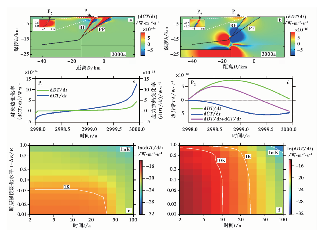 断裂带内部的增温异常则主要源自DT的作用。 图3f绘制了不同应力释放强度下的dDT/dt分布, 可见, 断裂带的增温强度明显高于非断层区域, 当断层的弱化速度< 30d时, 仅需 “ 微弱的” 断层活动即可造成高于1K量级的空气升温(图3f)。