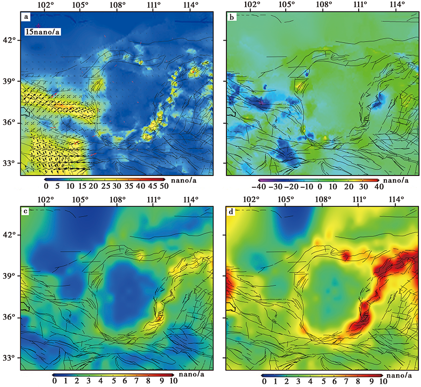 | 图 3 鄂尔多斯块体及其周缘的应变率场(单位: 1nano/a=1× 10-9/a) a、 c 最大剪应变率及其误差, 黑色箭头为主应变率; b、 d 面应变率及其误差Fig. 3 Strain rates in the Ordos block and its adjacent areas(unit: 1nano/a=1× 10-9/a). |