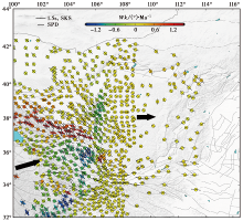 (2)鄂尔多斯块体西缘的银川-吉兰泰盆地和弧形构造带及东缘的山西断陷盆地现今的活动较强, 边界断裂以右旋走滑运动为主, 形成了2条明显的右旋剪切带, GPS基线对揭示其旋转量为0.2° ~0.4° /Ma; 块体南缘和北缘的河套盆地和渭河盆地变形较弱, 边界断裂具有左旋走滑分量, 旋转量约0.1° /Ma。