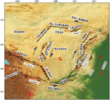 | 图 7 鄂尔多斯块体的旋转运动模式(改自Middleton et al., 2016) 红色圆圈为6.5级以上历史地震分布, 红色箭头为块体运动方向. 黑色数字为主要断裂的滑动速率, 左旋为负, 右旋为正Fig. 7 The rotation mode of the Ordos block(modified from Middleton et al., 2016). |