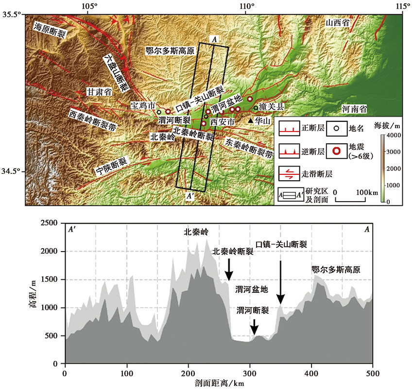 发生1556年华县大地震的渭河盆地位于鄂尔多斯地块南缘, 是由一系列正断层组成的大型盆地(图 1)。 研究表明, 渭河盆地边界的多数正断层至今仍在活动(国家地震局“ 鄂尔多斯周缘活动断裂系” 课题组, 1988; Zhang et al., 1998; 胡亚轩等, 2018), 华县地震震中就位于渭河盆地的东南部。 历史上渭河盆地内共发生过7次M6.0以上地震, 分别是780BC岐山M7.0地震、 7BC长安M6.0地震、 793年渭南M6.0地震、 1487年临潼M6.3地震、 1501年朝邑M7.0地震、 1556年华县M8.0地震和1568年西安北M6.8地震(王景明, 1983)。 1970年以来该区未发生过大地震, 以2~3级小地震为主, 但近年来4~5级地震逐渐增多(彭玉柱等, 2014)。 其中, 渭河盆地内发震时间距今最近的1568年西安北M6.8地震由渭河断裂(图 1)的活动所触发(韩恒悦等, 2002); 北秦岭断裂北缘(渭河盆地南部)以及渭河盆地内部的断裂曾多次引发6~8级地震(孟庆任, 2017), 且北秦岭断裂的大地震复发间隔约2~4ka(张安良等, 1992); 在渭河盆地北部, 活动性最强的断裂为口镇-关山断裂(李煜航等, 2016)(图 1)。 这一系列活动正断层成为该地区巨大的地震安全隐患, 直接威胁着渭河盆地多个大中型城市及数百个乡镇居民的生命和财产安全。