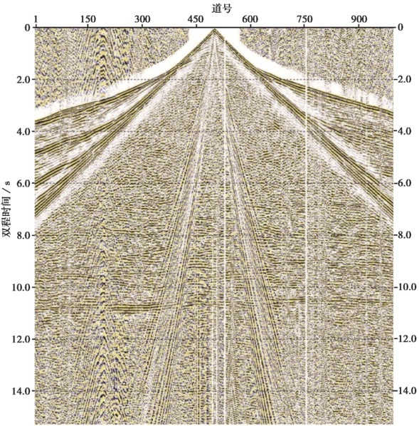 深地震反射剖面野外数据采集采用25m道间距、 1i000道接收、 超过62次覆盖、 双边对称接收的观测系统。 地震记录长30s, 采样间隔为4ms。 地震波激发采用钻孔爆破震源, 单井井深25m, 药量30kg, 炮间距200m。 所获得的原始地震记录(图 2)具有较高的信噪比, 在不同深度均可看到清晰的反射波组, 在双程旅行时(以下简称TWT)10.5~11.5s存在强能量反射波组, 可能为来自莫霍面的反射波组。