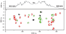 | 图 8 震源机制解沿深度剖面的变化 红色为逆断和逆断为主兼走滑, 绿色为走滑型断层, 黑色为正断和正断为主兼走滑Fig. 8 Seismic mechanism solution changes along the depth profile. |