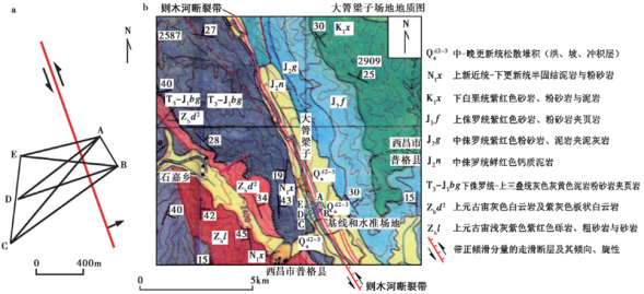 | 图 2 大箐梁子的点位、 测边图(a)和场地地质图(b)Fig. 2 Maps of baseline array(a)and geological settings(b)of the Daqingliangzi site. |
