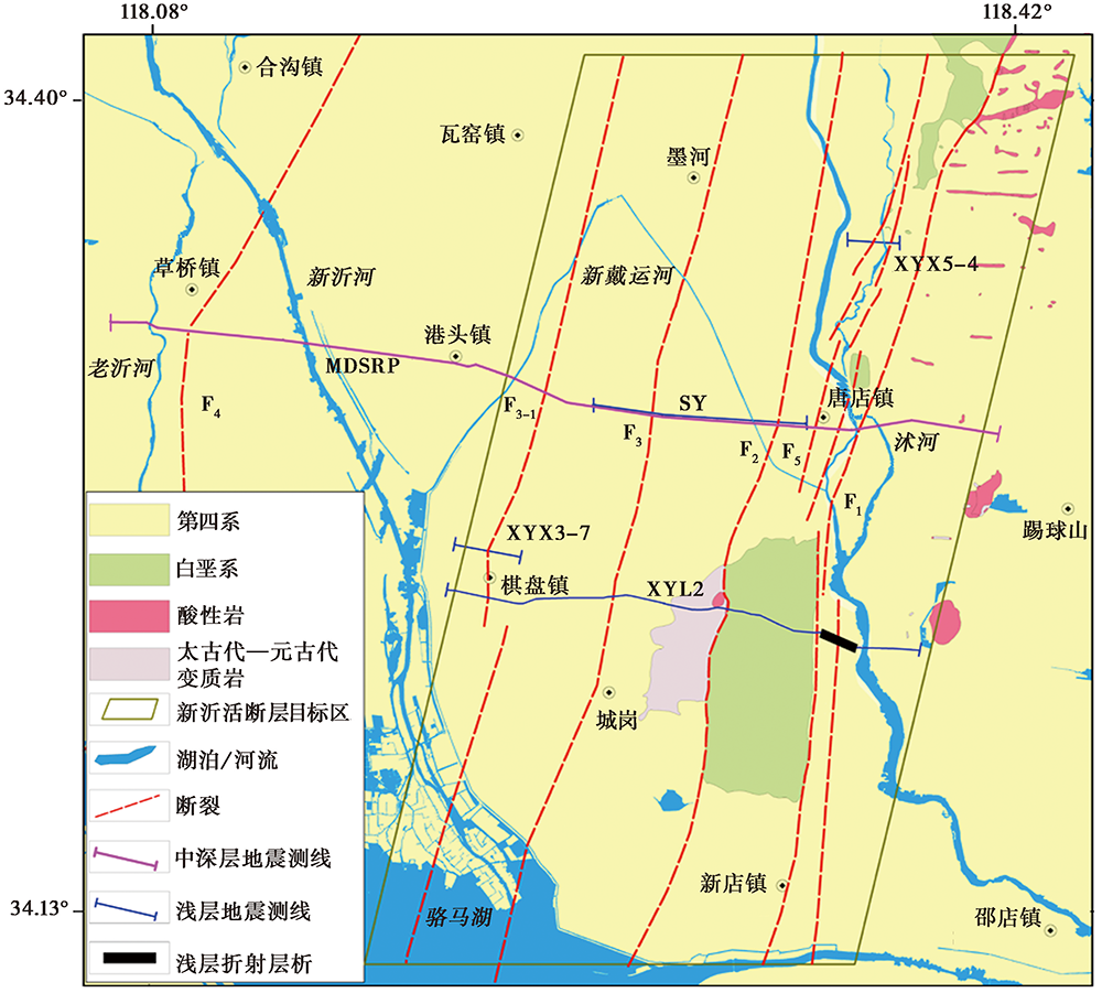 近年来, 大量国内外地球物理工作者对郯庐断裂带新沂段及邻区展开了相关研究。 地学者采用天然地震层析成像法(黄耘等, 2011; 吴萍萍等, 2015; 顾勤平等, 2016, 2020; 熊振等, 2016)获得了该区域的壳幔三维速度结构, 并对该区域的深部孕震环境和强震的发震机理展开了分析和研究。 张继红等(2010)和翁爱华等(2018)针对郯庐断裂带中段开展了大地电磁测深工作, 研究结果表明郯城地震的震中可能位于F1和F3的接触部位, 震源深度可能为15km。 近年来, 刘保金等(2015)采用高分辨率的深地震反射探测方法对郯庐断裂带中南段及其两侧地壳结构及莫霍面、 岩石圈底界面等展开了研究, 发现郯庐断裂带具有走滑、 挤压和伸展并存的构造形迹。 前人的研究成果为理解郯庐断裂带新沂段及邻区的深部动力学过程和构造环境提供了宝贵资料。 以上研究的目标层位均较深, 可用来研究郯庐断裂带中南段的深部构造环境、 孕震环境和发震机理等, 但对其地壳浅部结构和活动性并没有展开分析。 近期, 依托于 “ 宿迁市活动断层探测与地震危险性评价” 项目, 一些地质工作者(张鹏等, 2011, 2015; 许汉刚等, 2016; 曹筠等, 2018)针对郯庐断裂带宿迁段地壳浅部断裂的空间展布、 产状及活动性特征展开了研究, 并取得了一些新的科学认识和成果。 然而, 由于研究目标不同或受研究方法所限, 以往的研究成果或侧重于地壳深部结构, 或涉及的研究目标为宿迁段或其它区域, 而对郯庐断裂带新沂段的构造样式和深浅构造组合特征还未能给出精细刻画, 其活动性和空间展布还未能得到系统的研究。 此外, 有研究发现(Crone et al., 1991; 徐锡伟, 2006), 地震的孕育和发生不仅与深部地质构造背景和孕震环境有关, 近地表的活动构造线通常成为引发地震的重灾带。 由此可见, 深、 浅构造之间存在着某种内在联系(刘保金等, 2012)。 因此, 针对郯庐断裂带新沂段不同埋藏深度的断裂构造特征、 深浅组合关系的探索和研究工作亟待展开, 这项工作对理解地震发生的深、 浅地质构造背景和城市防震减灾工作都具有十分重要的意义。