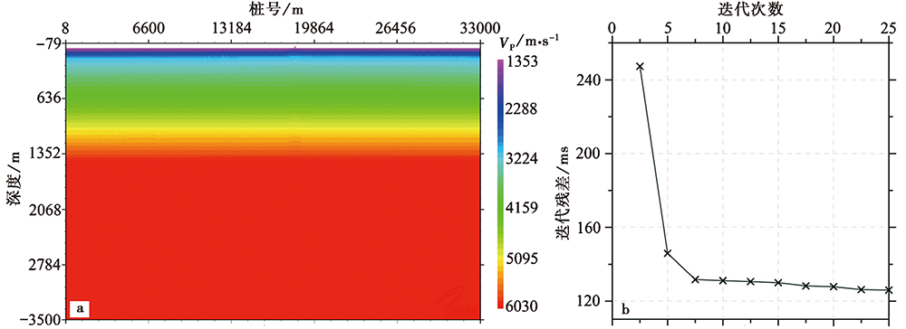 分别采用建模软件Tomodel和加拿大骄佳公司的基于非线性旅行时算法的折射层析成像软件(Geogiga DW Tomo)开展中深层和浅层地震初至波的层析工作。 初至波层析成像的处理流程主要包括线性动校正处理、 初至波到时的拾取、 建立初始速度模型(图3a)、 正演射线追踪得到理论走时、 多次迭代反演计算及完成速度结构分布成像等。 图3b给出了25次迭代的收敛曲线, 走时残差由247.3ms降低至125.9ms, 走时均方差基本趋于稳定且不再继续下降, 取此时反演获得的速度模型为最终结果(图4c)。