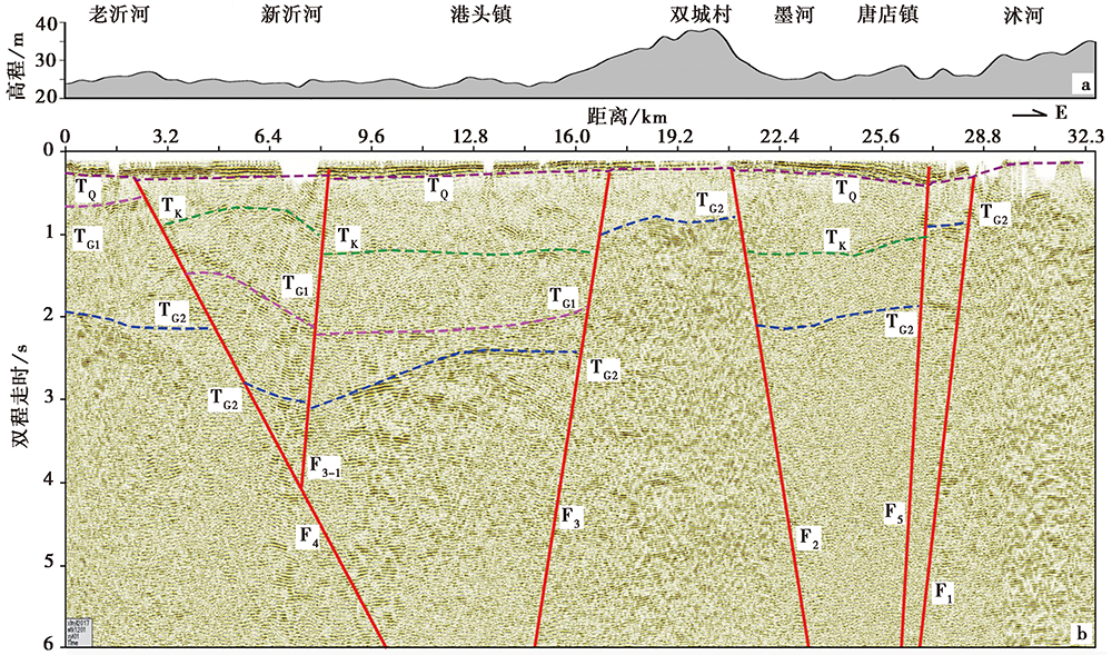 中深层地震反射剖面在横向上存在着明显的变化, 大致以F4、 F3、 F2、 F1断层为界, 可分为5个区段, 横向上呈现为地堑-地垒-地堑的展布形式。 第一区段位于纪集-王集断裂(F4)以西, 浅部新生界底界(TQ)反射明显。 第二区段的西侧以F4断裂为界, 东侧以墨河-凌城断裂(F3)为界。 该区段为这2条高角度断层围陷、 中间下降的槽形断块构造, 由此构成了郯庐断裂带 “ 两堑夹一垒” 的西侧地堑。 该区间内的地层反射波组能量强、 相对丰富, 尤其是元古界顶界面(TG2)及其以深地层。 第三区段位于F3和F2断层之间, 西侧以F3断裂为界, 东侧以新沂-新店断裂(F2)为界, 由这2条倾向相反的正断层所界限而中间断盘上升形成一小地垒, 同时, 该地垒在地形地貌上也有所体现, 即地形相对两侧呈隆起状(图5a)。 第四区段西侧以F2断裂为界, 东侧以山左口-泗洪断裂(F1)为界。 与第二区段类似, 第四区段是由这2条高角度断层构成郯庐断裂带 “ 两堑夹一垒” 的东侧地堑, 区间内地震反射波频率有明显降低的现象, 而东部区域的断裂(F2、 F5、 F1)向深部延伸并有逐渐会聚趋势。 第五区段位于F1断层以东, 具有古老地层的结构特征, 地层有效反射波组较少, 受地表沭河的影响, 浅部有效采样不足导致新生界底界(TQ)覆盖次数不够而呈现出较弱的特征。