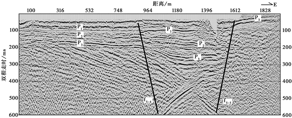 图8给出了XYX5-4测线的叠加时间剖面。 由图8 可见, 该剖面清楚地揭示了马陵山-重岗山(F5)断裂由2条近直立发育、 相向而倾的主干断裂组成, 这一特征与郯庐断裂带宿迁段局部地区相吻合(许汉刚等, 2016)。 剖面显示F5断裂具有断陷的特征, 由西(f5-4)、 东(f5-5)2支断裂组成。 f5-5 断点东侧只有基岩顶面反射波P3发育, 其双程走时为20~70ms, 自西向东有向上抬升的趋势; f5-4 断点两侧除发育基岩顶面P3以外, 松散沉积层内发育多组反射波组(P1、 P2)。