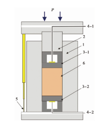 | 图 2 超声波与位移传感器的布置及样品装样图 1 碳化钨样品腔; 2 碳化钨活塞; 3-1、 3-2 超声波换能器; 4-1、 4-2 超声波换能器引线; 5 位移传感器; 6 样品Fig. 2 The sample assembly and arrangement of ultrasonic and displacement transducers. |